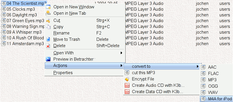 audiokonverter is a service menu (and also a commandline utility) to easily convert from MP3, OGG, AMR, AAC, M4A, FLAC, WMA, RealAudio, Musepack, Wavpack, WAV and movies to MP3, OGG, M4A, WAV and FLAC in Konqueror by right-clicking on them. It needs ffmpeg/avconv, oggenc, oggdec, faac, faad, flac, mplayer and lame to work. id3lib is optional for full functionality. Also optional are vorbis-tools and metaflac for handling other metadata. See README how/where to get that software.