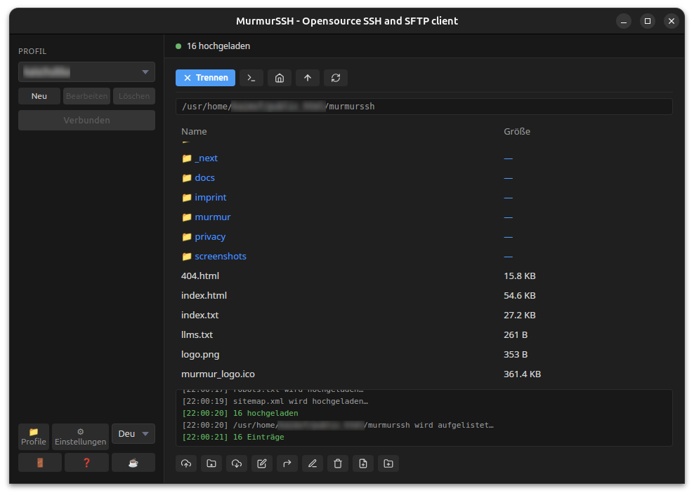MurmurSSH is an open-source SSH and SFTP client for Linux, designed as a simple, reliable, and fully local alternative to cloud-based or complex tools. It focuses on clarity and usability, offering a minimal interface, fast connection handling, and straightforward file operations. All profiles and configurations are stored locally — no accounts, syncing, or background services.