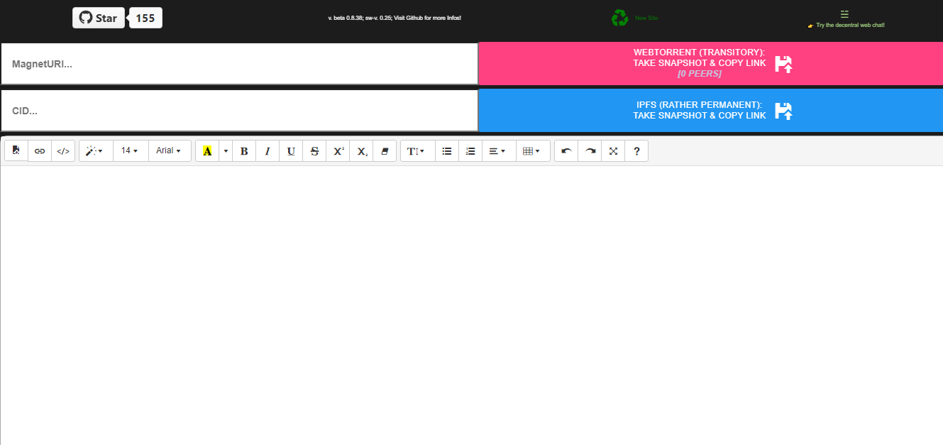 Peer Web Site supports content encryption aka. salting since v. beta 0.8.0. The code regarding this feature can be found at: EncryptDecrypt.js and ensures that the passwords/passphrases do net get saved nor sent anywhere. This is a very convenient feature to secure your content. Although, it can not encrypt IPFS nor WebTorrent files added to your site and purely encrypts the actual content, which you enter through the text editor or devtools, as well as embedded Base64 files. Send Texts, Music, Pictures and Videos embedded in HTML with CSS and JavaScript through WebRTC, WebTorrents or IPFS, live edited P2P as well as static Torrents + IPFS. With WebRTC/WebTorrent (NOT IPFS - more details) - No conversation data passes a server nor is saved anywhere but sent directly from browser to browser. Your website disappears from the aether as soon as you close or reload your tab, except of your WebTorrent/IPFS snapshots.